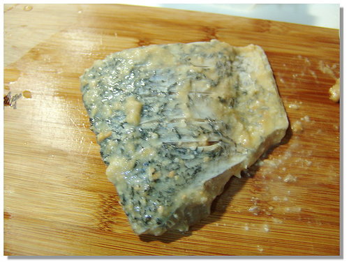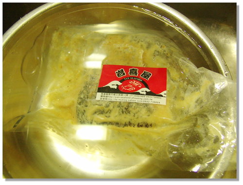 將退完冰的味噌鱸魚上面的味噌可以依個人口感決定要不要刮除,當然味噌越多就越”入味”囉