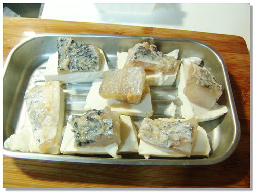 將味噌魚片也切成塊狀之後放在豆腐上面