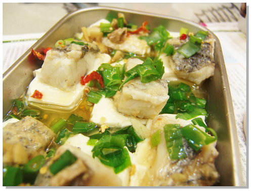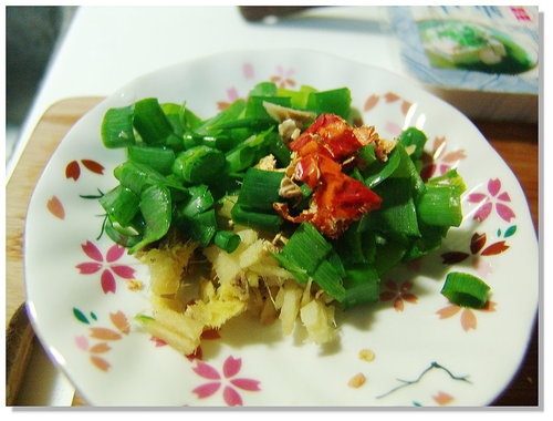 將炒菜油和香油以1:1的比例混合,另外加熱,然後淋在魚片上將細薑末、辣椒末、及蔥花爆香,就大功告成了