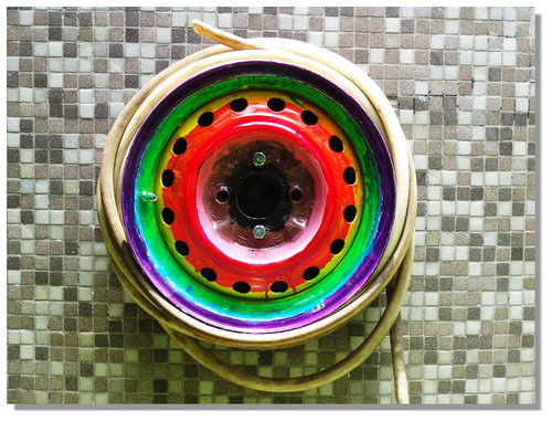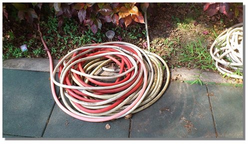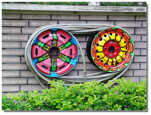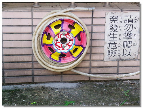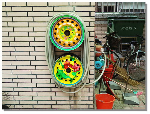 學校的水管常像這樣弄完就捲成堆放一旁,有天校長交辦說要用廢棄輪胎框收水管,增加美觀