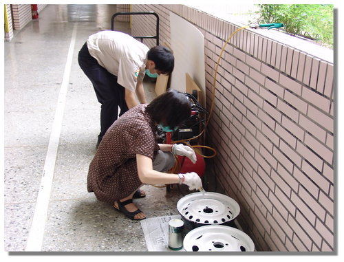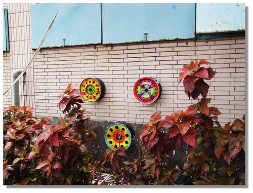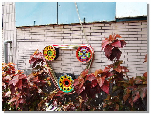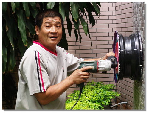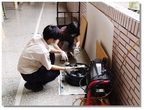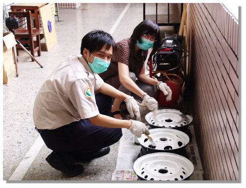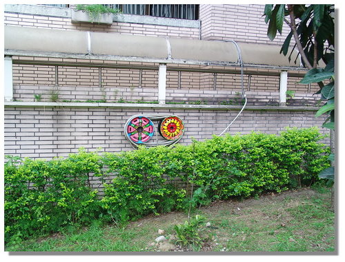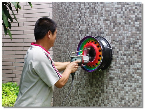 後來當我在思考要怎麼把輪胎框釘在牆壁上時,學校的協力廠商松竹花市的彭老闆說他會做,我說那就交給你處理囉,且是免收費幫忙的喔!他二話不說的說OK!