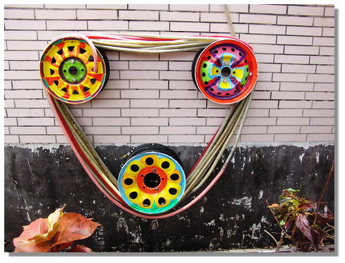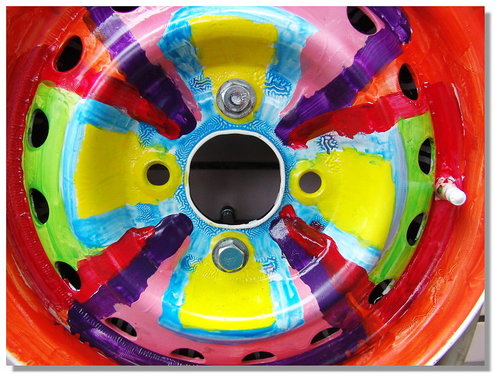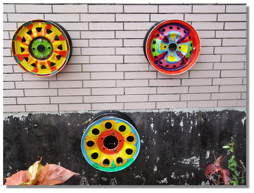 輪胎框上完底色之後,由六年級的小朋友在美勞課時發揮創意將輪框彩繪