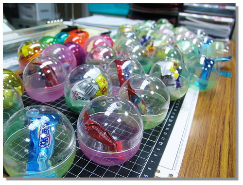 開始分裝扭蛋囉,裡面我裝了吃的零食、文具、小公仔…等的多元禮物。