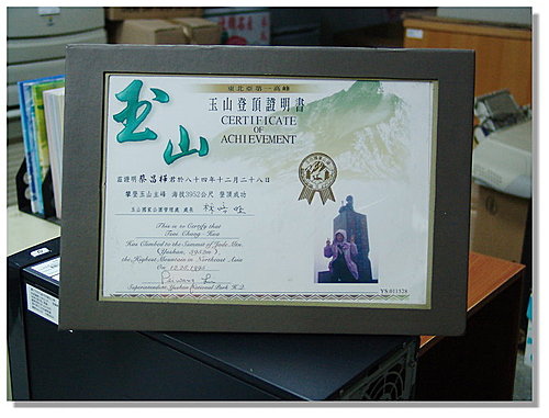電腦主機上放上我爬過台灣第一高峰~玉山的登頂證明書