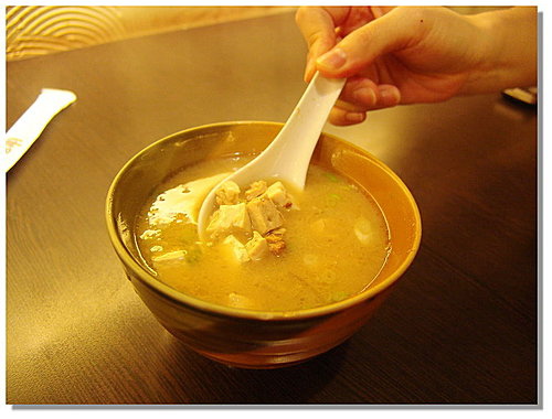 這是它的味增魚湯,裡面有魚肉,魚骨頭可以咬一咬吞下去喔,這湯也頗為好喝
