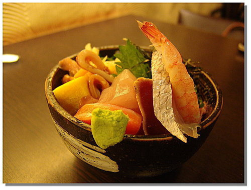 我主菜點一個什錦丼,真得不得不讚美一下,它的生魚片量還不少,且非常的青,真得很讚,價位才$150-,以台北這首善之都而言,真是便宜又大碗啦