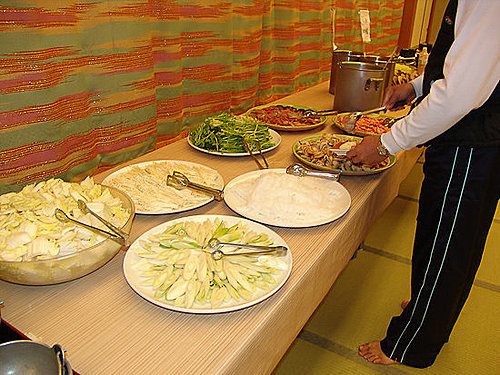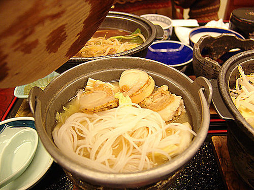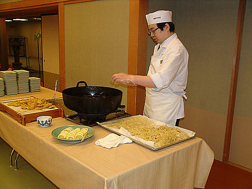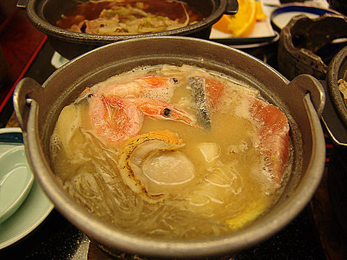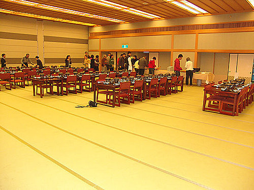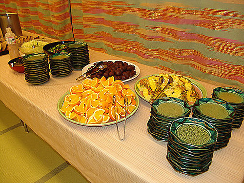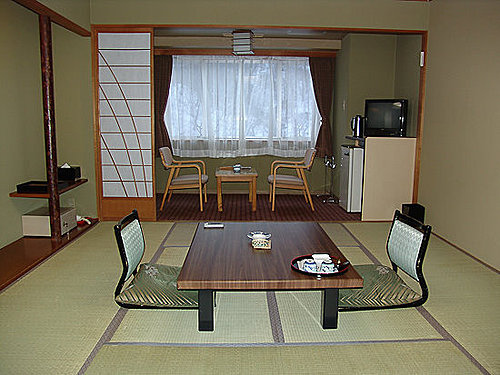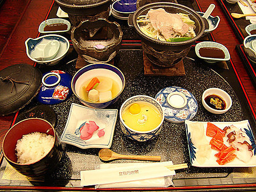 今天的晚餐跟前幾天不太一樣喔!是「迎賓和善會席」,就是在一間大餐廳裡面,不過不是席地而坐,是有一個小矮椅的。