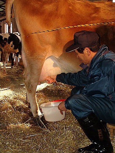 牧場主人先帶我們去擠牛奶,不過我對這個就沒啥興趣,就只有在旁邊看而已…