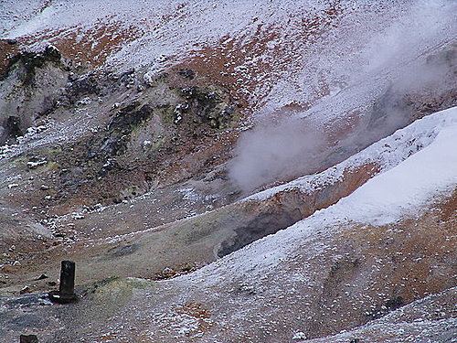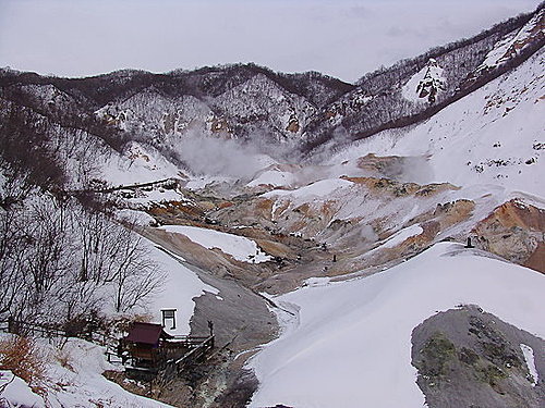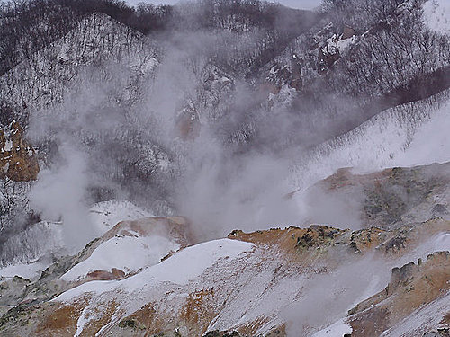 【登別地獄谷】登別溫泉中給人印象最深的是地獄谷,火山氣體從灰黃色的岩石表面向外噴出,周圍空氣中充滿了濃烈的硫磺異味,簡直是一幅地獄中的景象。山谷是直徑爲450米的爆裂火口,溫泉的出水量每分鐘高達3000 立升。