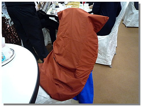 服務人員馬上拿個套子來把它套上,當然這是怕在送餐的過程中如果有油水滴到客人的衣服上,容易引起糾紛。這樣的做法不但保護自己,也保護客人,蠻貼心的。