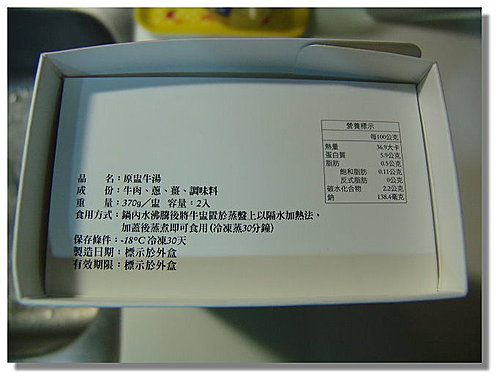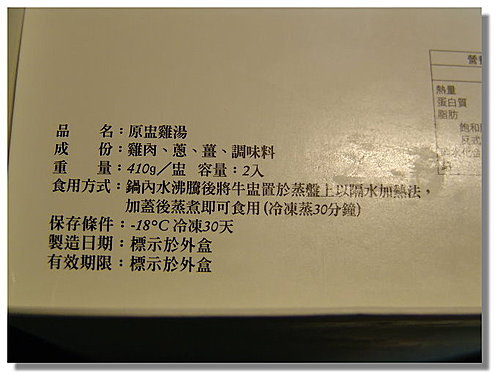 如簡介所說,冷凍的要隔水水滾後蒸個十五分鐘囉! 記住用中小火就好了… 這菜包用料很實在,但是吃起來我覺得還OK而已,不是那麼吸引我就是了,可能我不是很喜歡吃起來「很多菜」的感覺。我是肉食性動物… 再來要介紹原盅牛湯囉! 簡介如上 一盒內有二盅 把盅蓋打開,都是冷凍的… 隔水加熱蒸個30分鐘(還是一樣用中小火即可) 起鍋囉! 如上圖所示,這原盅牛湯的湯非常清澈…感覺好像清水一樣 但喝起來味道頗鮮美,這口感頗讚,我覺得很順口,牛肉的品質也不錯,但還是達不到我夢幻中逸品的等級 我給它4顆星 再來本文的主角要出現了.... 就是....... 原盅雞湯... 老實說在這之前我沒有喝過鼎泰豐的雞盅,我只喝過「鼎秦豐」的雞盅,那次喝完讓我的感冒好了大半(如前傳所寫) 之前在商業周刊的alive版也有介紹到鼎泰豐的雞盅,更堅定我一定要喝到它的想法... 雞盅的簡介 一樣,一盒內有二盅