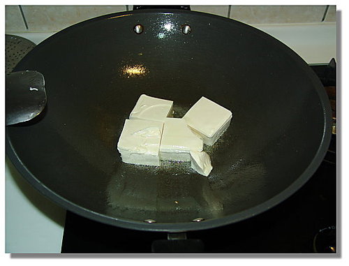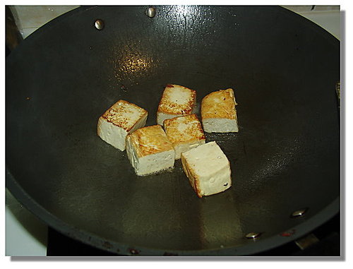 不過這次的煎豆腐我覺得還有改進之處,首先可以再將豆腐切小顆一點,比方說切成八塊或十塊,這樣煎時裡面裡面也可以較熟一點。