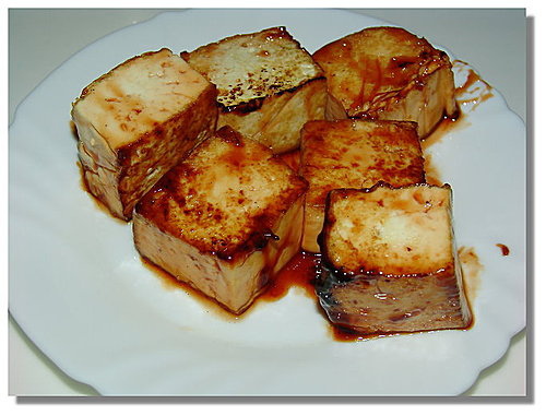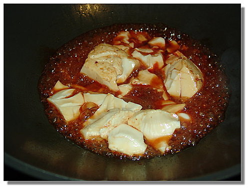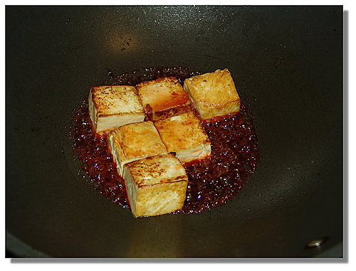 煎到豆腐外表焦黃,下蒲燒醬,再煎到收汁就好了