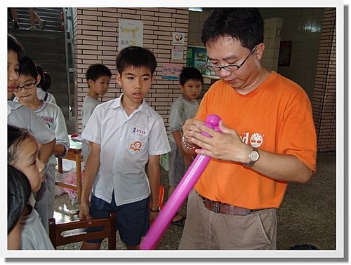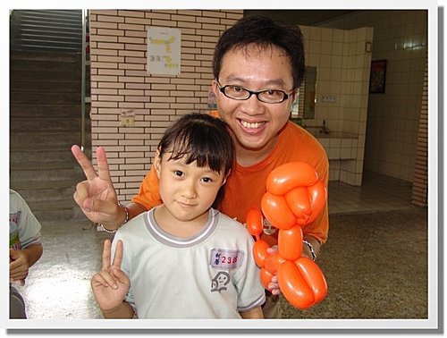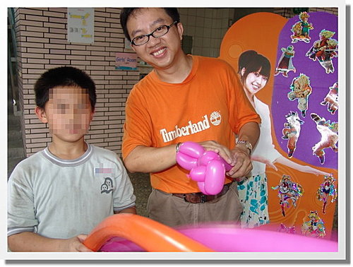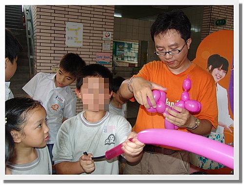 我以為這種「小玩意」應該沒有人會買吧!但是沒想到我錯了…. 我一到攤位,馬上有人要買,就這樣我開始我的折氣球生意,且一直折一直折一直折…… 折~很~大……都沒停過………..且竟然還排起隊來了.....我流了滿頭汗... 到後來我先把生意「告一段落」,我也想去逛一下跳蚤市場,最後走到療傷系小喆班上,在那班我又開始讚助折氣球義賣,結果又是生意不斷,一直折折折… 天啊!氣球有這麼迷人嗎??? 在小喆班義賣好一陣子後,我又回到資源班的攤位,秀娟老師問我說我跑去哪了,因為還有一堆人要來買氣球,都找不到我….. 於是我又開始折折折,沒想到又排起隊來了… 這時後我遇到「他」(編案:http://tw.myblog.yahoo.com/201-kd/article?mid=2356&prev=1594&next=2348), 他跑來說要幫我,我當然說好,有個小女生要一隻貴賓狗,我請「他」折,結果…..折起來那小女生說 「我要貴賓狗,不是臘腸狗….」 我聽到差點笑出來……原來「他」對貴賓狗的折法不太瞭解… 後來我就請他幫我打氣,還有折劍, 有了幫手,果然輕鬆多了…