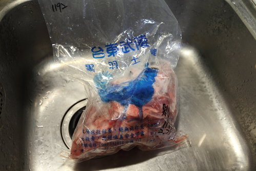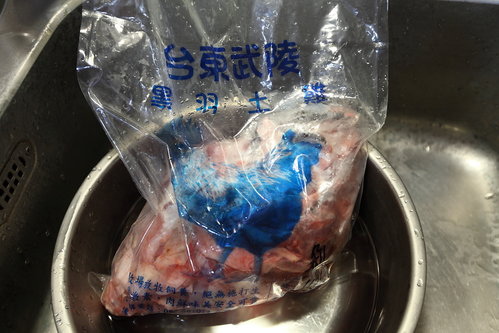 因為我拿到雞已經是完全處理好且剁好與冷凍了,所以還是要退冰一下,我把它從冷凍庫拿出來放在室溫下,經過一個多小時還是沒解凍,只好用水沖來解凍囉。解凍後我又將它分為幾小包,這樣以後就可以分多次料理了。