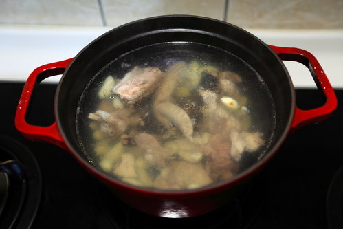 其實隻雞沒啥腥味耶,但是我還是先將雞肉先用別的鍋子川燙一下去腥味,然後第一次水滾後把大量蒜頭與雞塊加進去我的鑄鐵鍋,然後加點鹽巴,然後蓋上鍋蓋後用中火滾個30分鐘,就起鍋了,非常的簡單