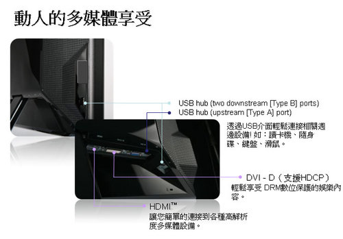 我發現我電腦主機還好當初顯示卡用的還不錯,所以竟然三種訊號輸入介面(HDMI/DVI-D/VGA)都支源,所以我當然捨去傳統的VGA(類比訊號)不用,一開始我就直接插HDMI線,天啊!那畫質之精細(19201080),讓我驚豔!