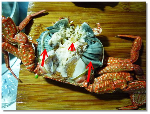先把石蟳的殼跟身體扒開,把牠的腮(上圖左右二個長箭頭)去掉,中間短箭頭是蟹蟳類的心臟,聽說屬極寒之物,大家都不建議吃這玩意,也是要去掉...