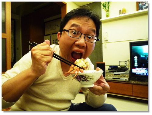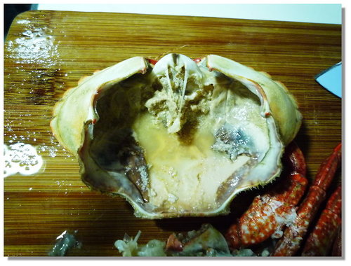 處理好把身體頗半,把大螯敲碎,這樣等一下放到湯裡去煮的時後,鮮味才易溶到湯裡...