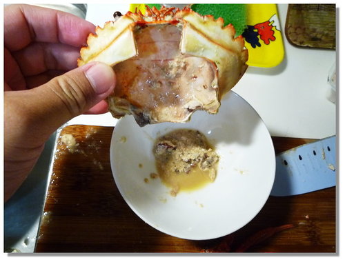 蟹蟳類的嘴巴連接的是牠的胃(上圖左邊那一小塊東西),裡面聽說也蠻多髒東西的,所以也建議不要吃,把它去掉....