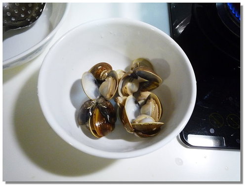 蛤蜊開了就馬上撈起來,不要一直煮,這樣會老掉喔!!先撈起來在旁邊備用...