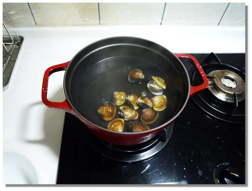 把鍋子加7分滿的水,水滾之後先把蛤蜊放進去煮...