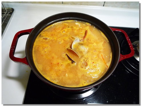再來繼續把味噌、豆腐加進去水裡,煮到水滾再放石蟳進去(因為這石蟳已經是熟的了,所以等水滾再放,比免煮太久老掉...)